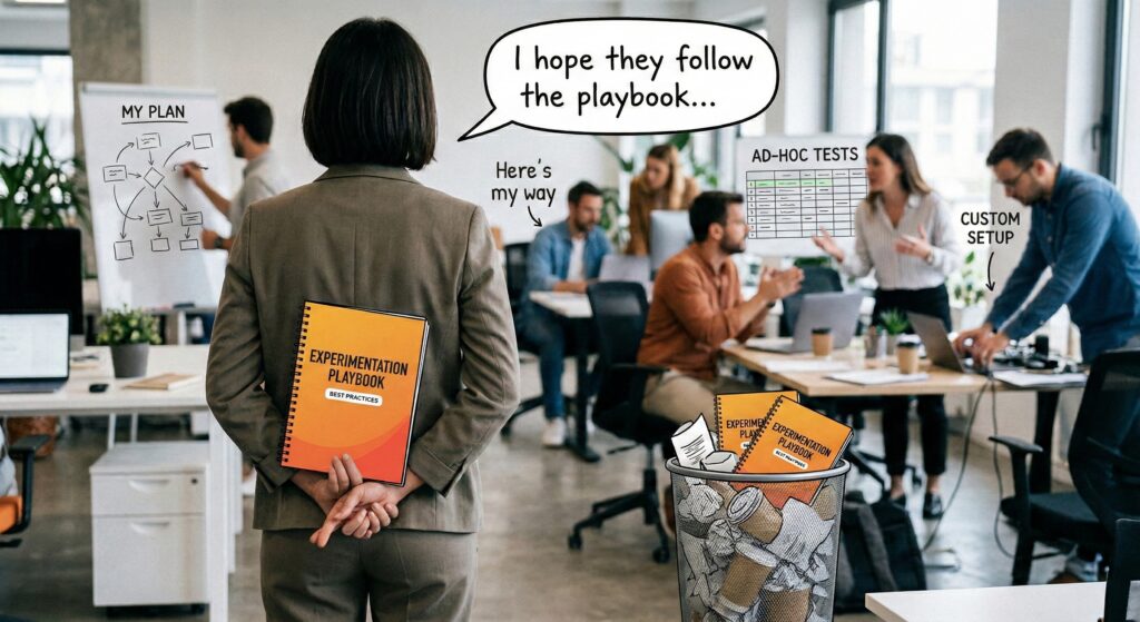 Most organisations run their experimentation programmes on hope. Hope that teams will follow the playbook. Hope that insights will be shared. Hope that someone will connect experiments to strategy. A company invests in testing tools, hires specialists, maybe even writes a playbook. Then they hand it all over and wait.