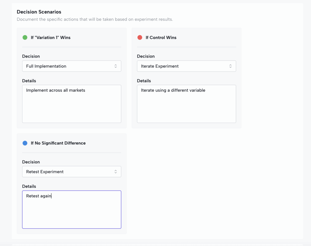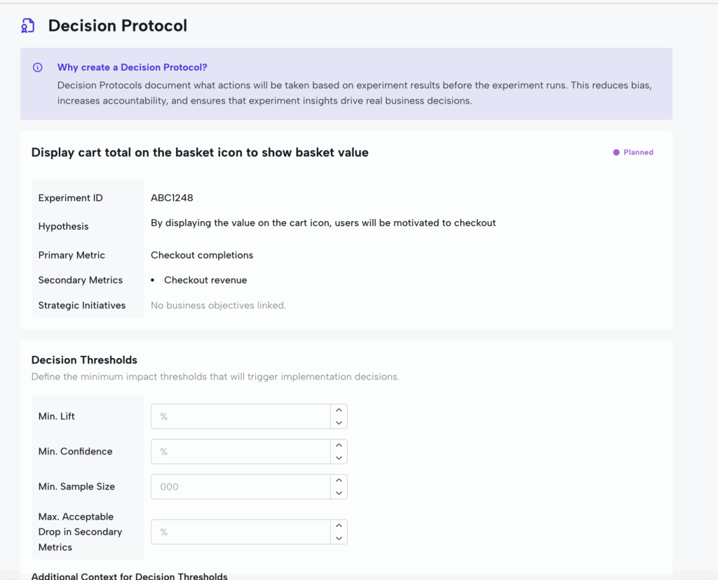 A recent customer case illustrates Decision Protocols’ power across different outcome scenarios. A software company was testing checkout process changes with high expectations based on user research. However, their predetermined protocol included multiple decision paths: