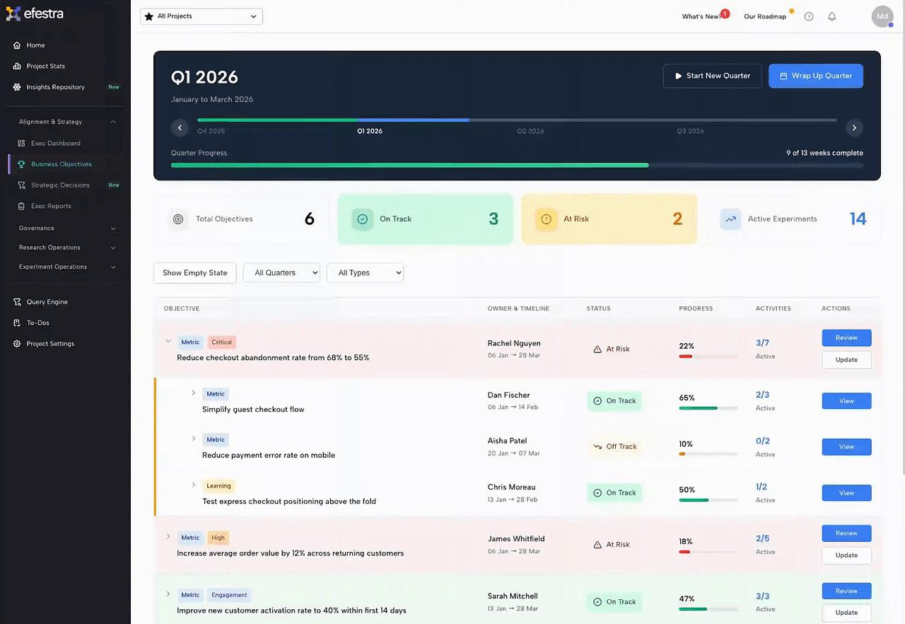 See what every team is testing, where experiments overlap, which objectives have evidence coverage, and which have blind spots. No more siloed reporting from each team.