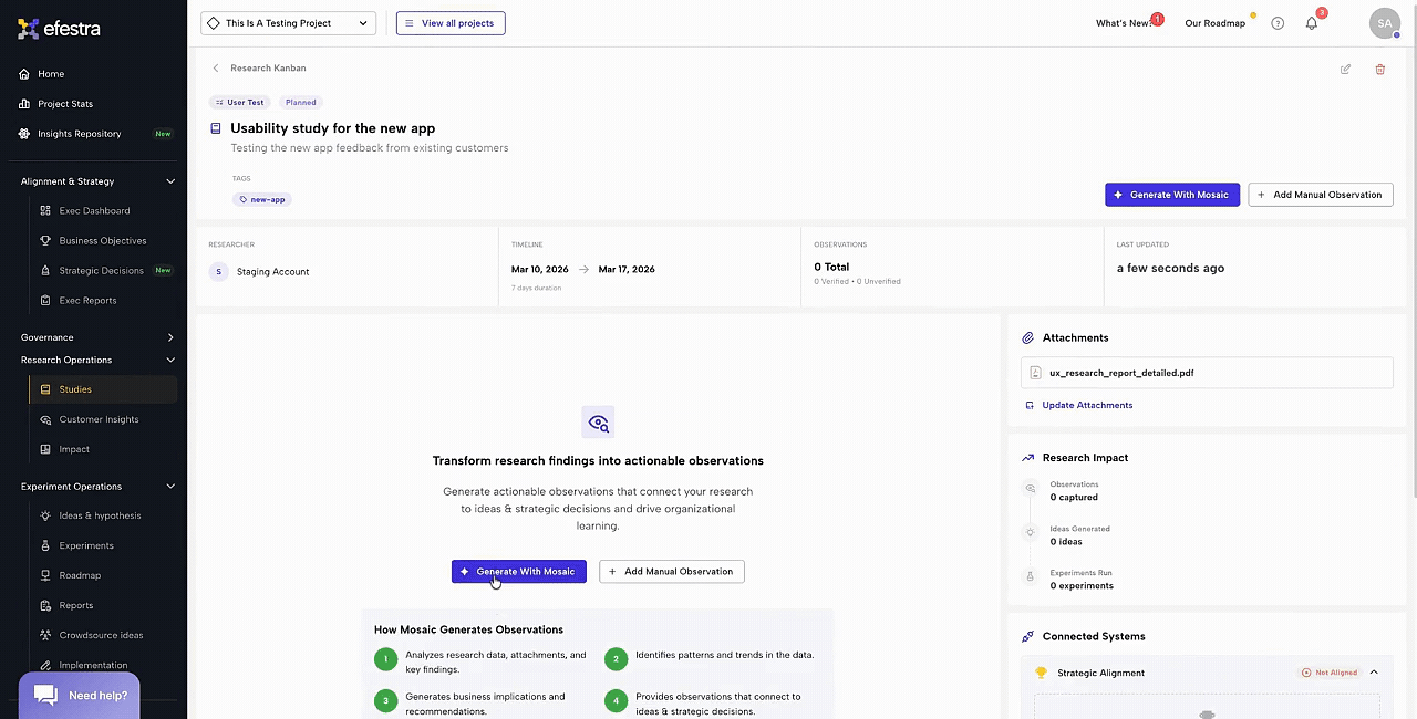 Every experiment and research study connects to a strategic objective and a decision owner before it begins. This is not tagging. It is a structural connection that ensures evidence is generated with a decision in mind, not as an activity without purpose.