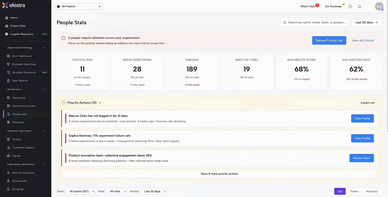 Scaling experimentation is not just about running more tests. It is about ensuring that quality does not degrade as more people and teams participate. People analytics shows you where process adherence is strong, where it is slipping, and where individuals or teams need support before bad habits become embedded practice.