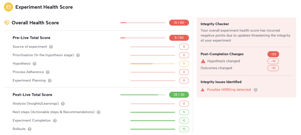Every experiment receives a governance score based on how well it met quality standards: was the hypothesis documented before launch, was the metric stable throughout, was a decision rule pre-registered, was the result acted upon. The programme-level score gives leadership a single number that reflects evidence quality across the organisation.