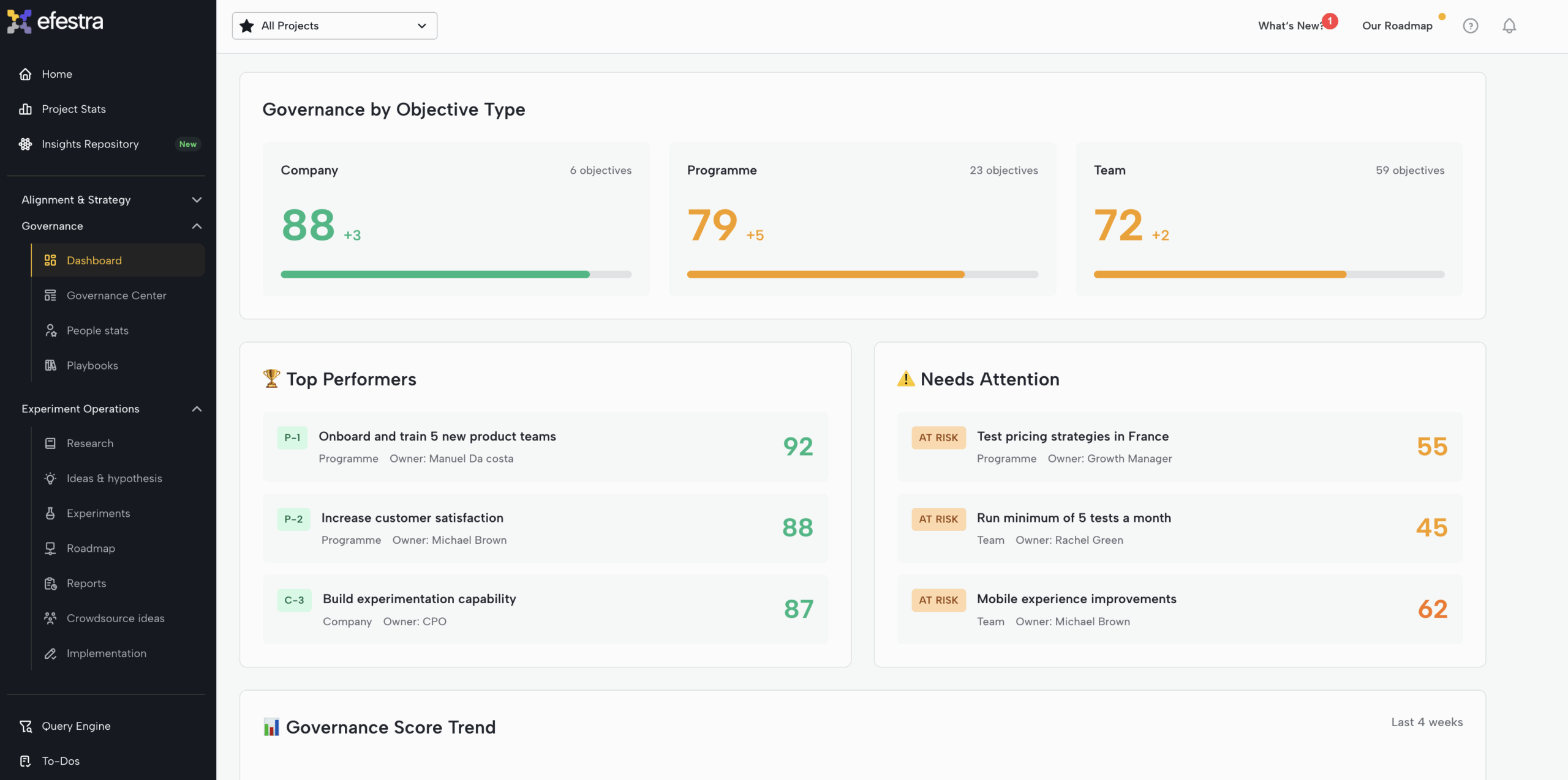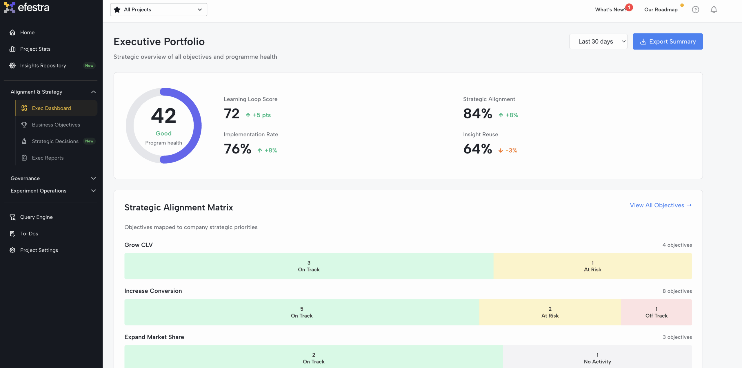 Efestra enforces that every experiment justifies its strategic relevance before launch. Leaders see exactly how testing resources map to business objectives.